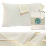 Set includes: 1 Fitted, 1 Flat and 2 Pillowcases packaged inside a reusable storage bag made from repurposed scrap bamboo fabrics.