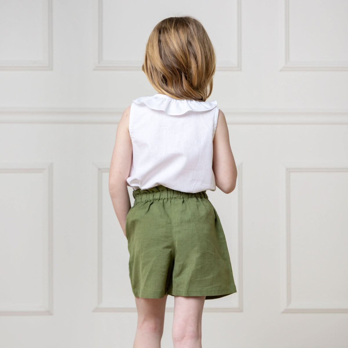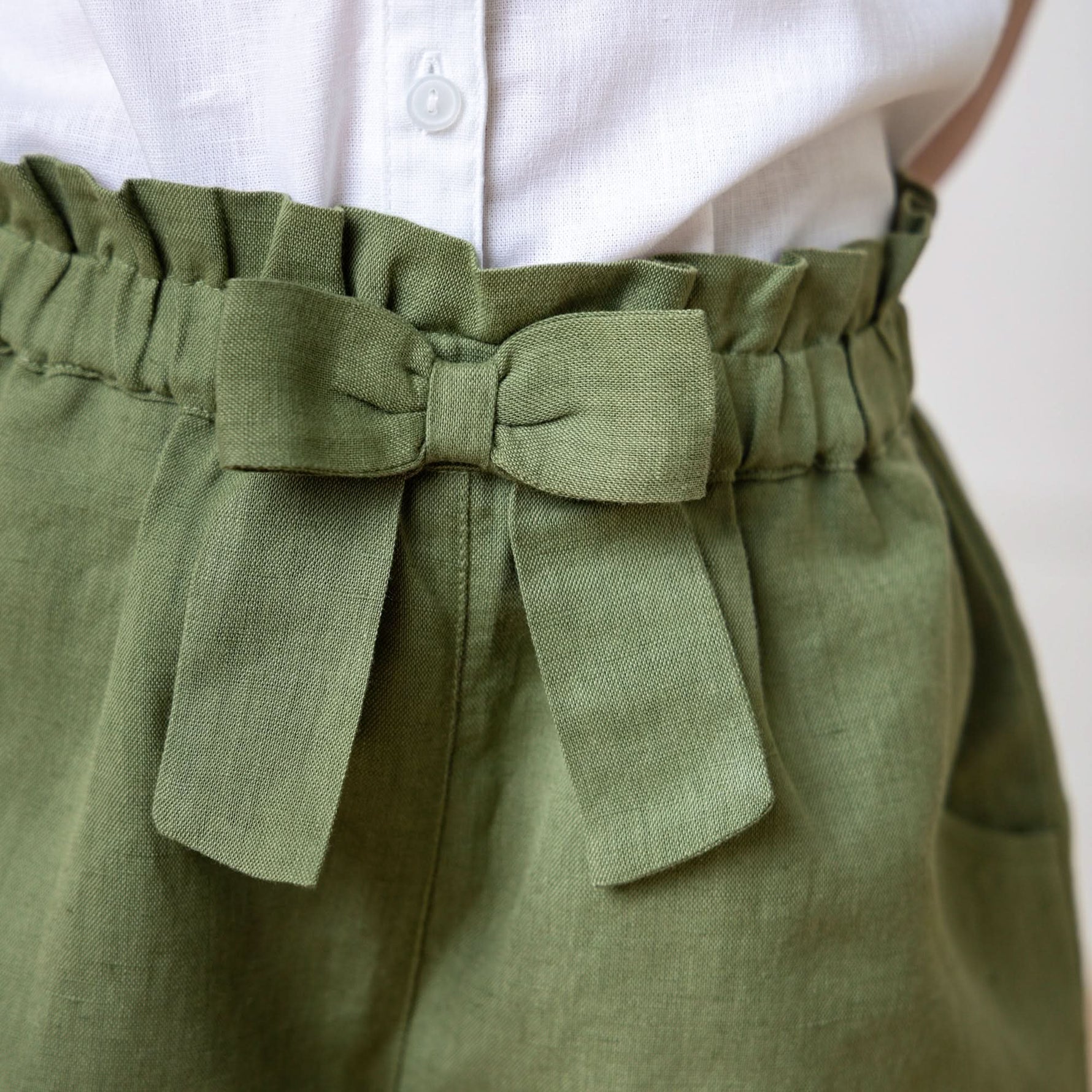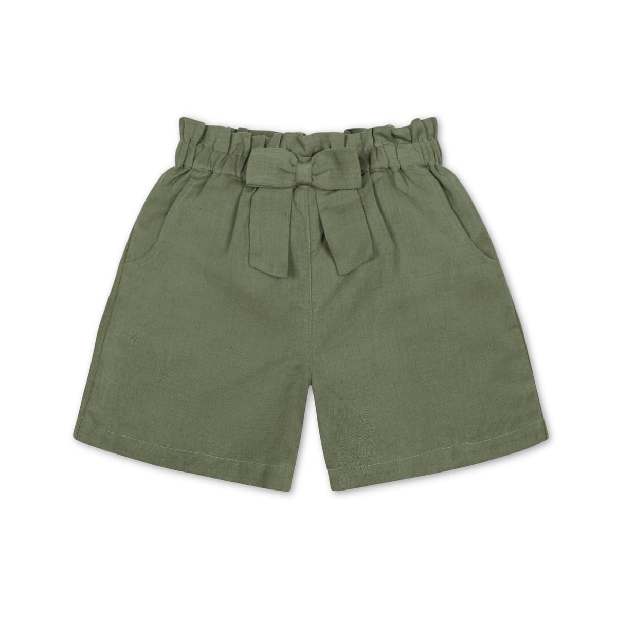 Our easy breezy cinched waist short in a soft organic cotton linen blend will keep your girl comfortable all spring and summer long. Features paper bag styling, side pockets, a waist tie with bow, and elastic at the back waist for easy on and off. Pairs beautifully with our flowy knit tops!