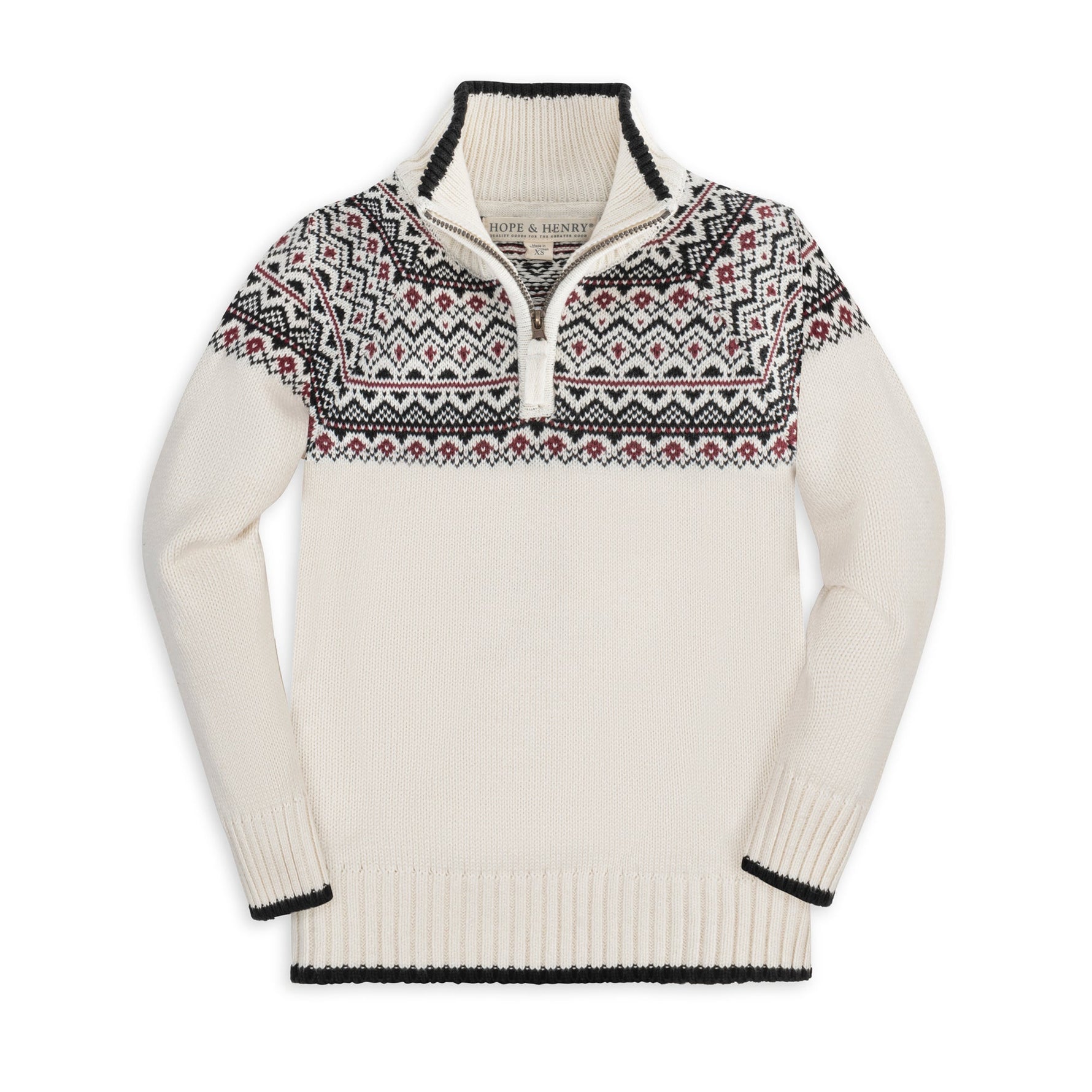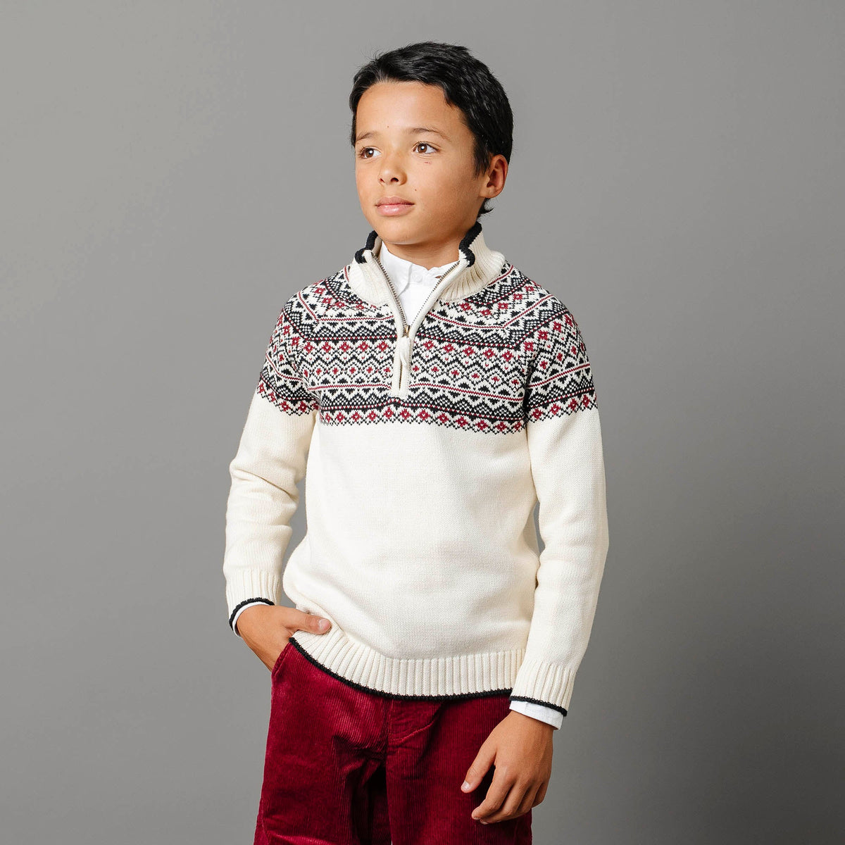 Make a statement this winter in our handsome half zip ski sweater for boy. Features a front half zip for easy-on and easy-off, raglan sleeves, and a striking geometric fair isle intarsia design at the shoulders. Rib knit at the collar, cuffs, and hem with contrast tipping. Pairs perfectly with our collection of classic organic cotton button downs.