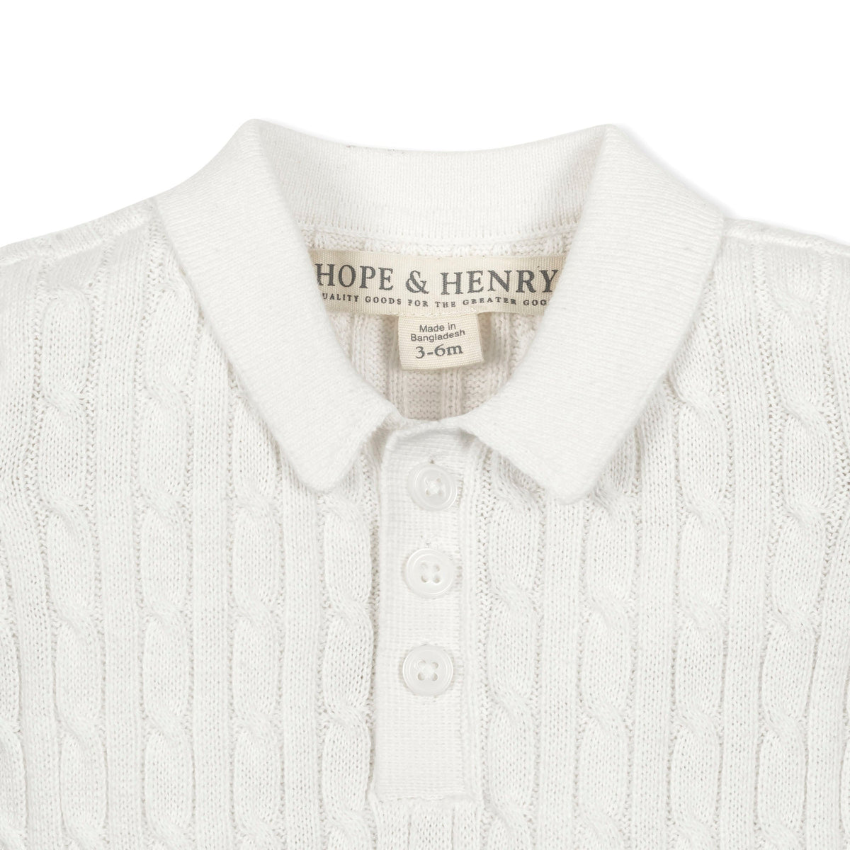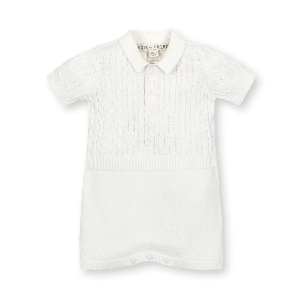 • Cable knit on body; flat knit on sleeves, collar, and bottom. Buttons at the center front and inseam for easy diaper changes.