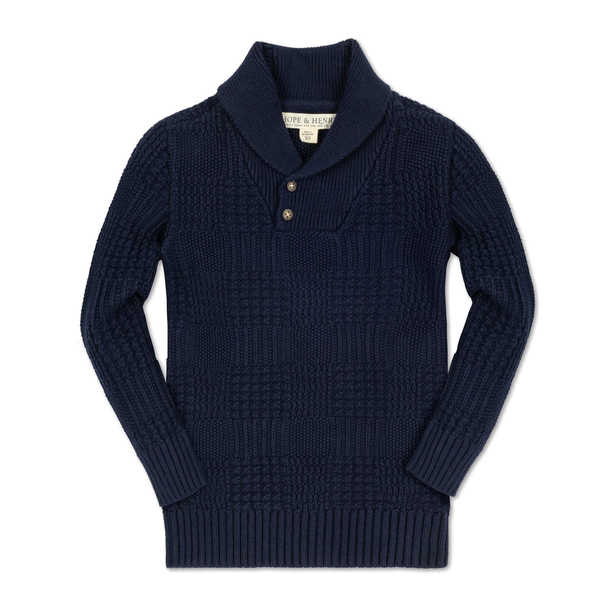 Our shawl collar sweater in soft organic cotton is the ultimate in comfort and style for your boy. Special attention to details such as the shawl collar with button closure and a chunky glen plaid textured stitch make this an instant classic that can be worn on repeat and handed down time and again.