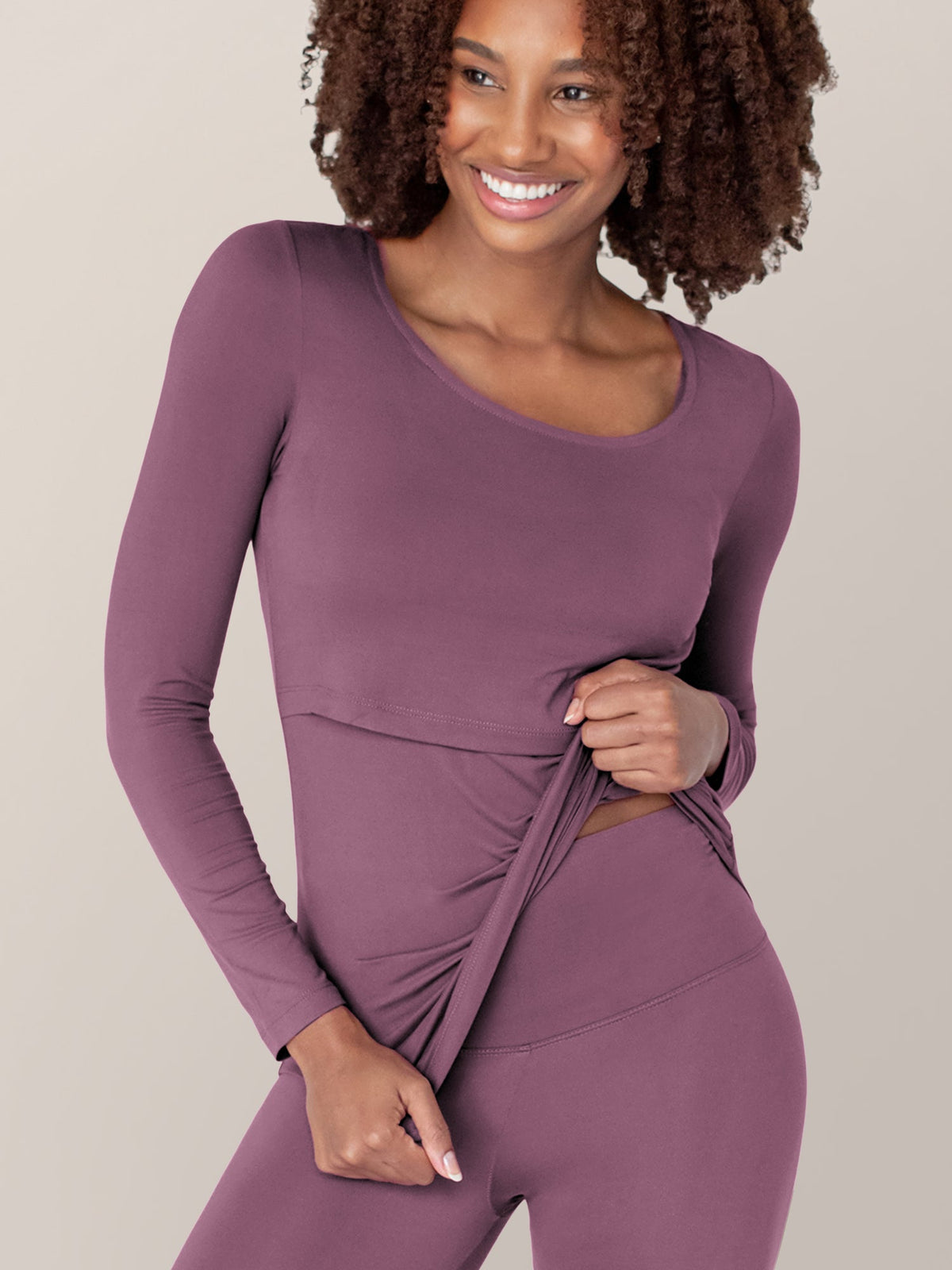 The nursing pajamas or “long janes” of your dreams. The snug silhouette comfortably fits under other clothes to keep you warm, and the nursing panel makes it easy to feed your little one at home or on the go.
