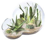 The unique double sphere glass terrarium was designed to give you the best growing experience possible. This custom high-quality glass terrarium was engineered to facilitate side air flow while still maintaining a humid growing area conducive to making plants thrive! Cacti and succulents are the perfect plant for terrariums and they will naturally limit their growth to match the size of the container they are growing in. They will flourish for years with minimal water. Everything you need is included- just add water! This elegant container with its miniature plants makes a beautiful addition to any space!