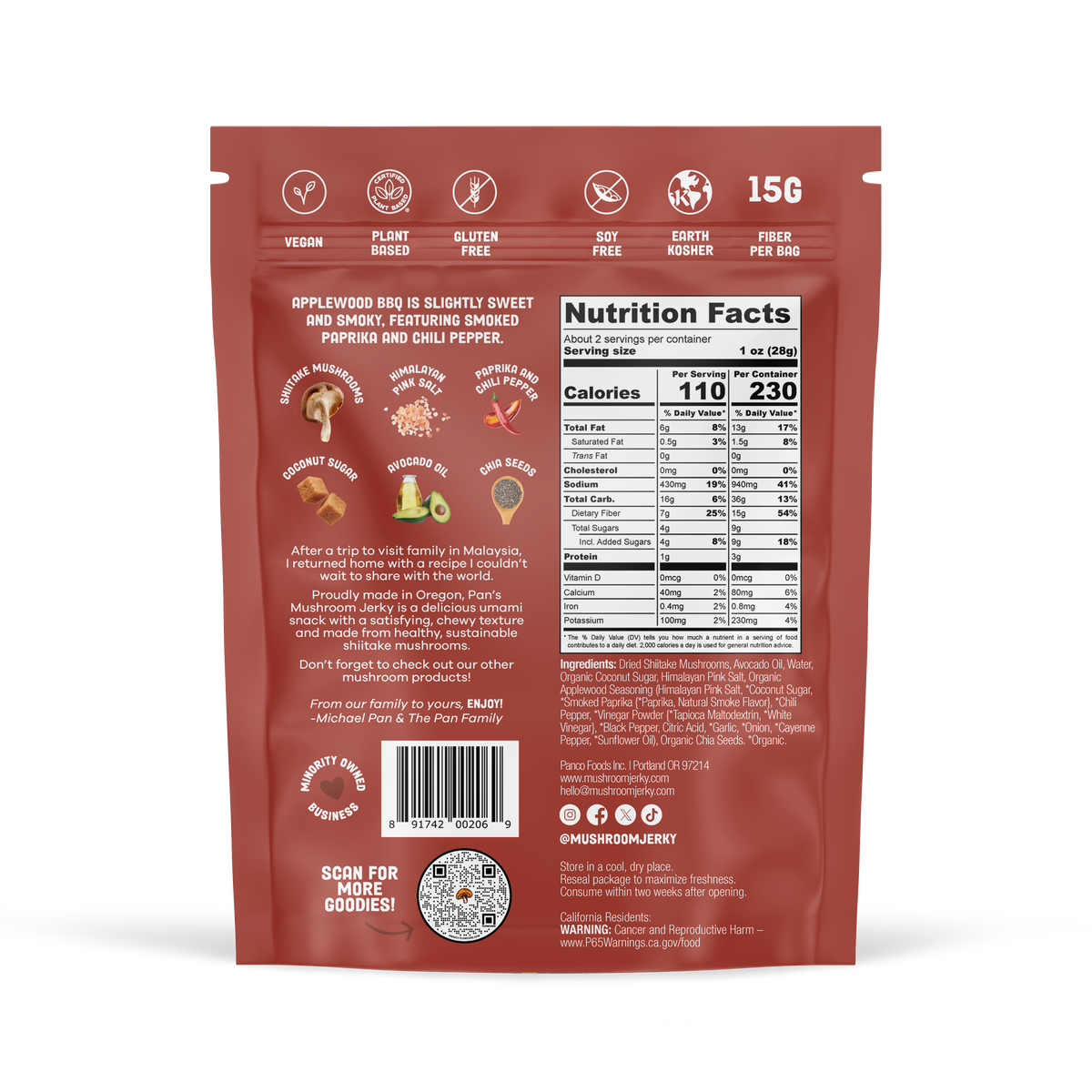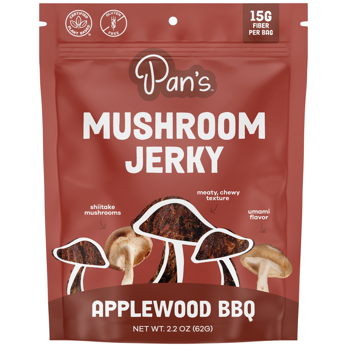 Pan's Applewood BBQ Mushroom Jerky is sweet, smoky, and delicious.
