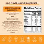 Ingredients: Dried Shiitake Mushrooms, Avocado Oil, Water, Organic Coconut Sugar, Himalayan Pink Salt, Organic Applewood Seasoning (Himalayan Pink Salt, *Coconut Sugar, *Smoked Paprika {*Paprika, Natural Smoke Flavor}, *Chili Pepper, *Vinegar Powder {*Tapioca Maltodextrin, *White Vinegar}, *Black Pepper, Citric Acid, *Garlic, *Onion, *Cayenne Pepper, *Sunflower Oil), Organic Chia Seeds. *Organic.