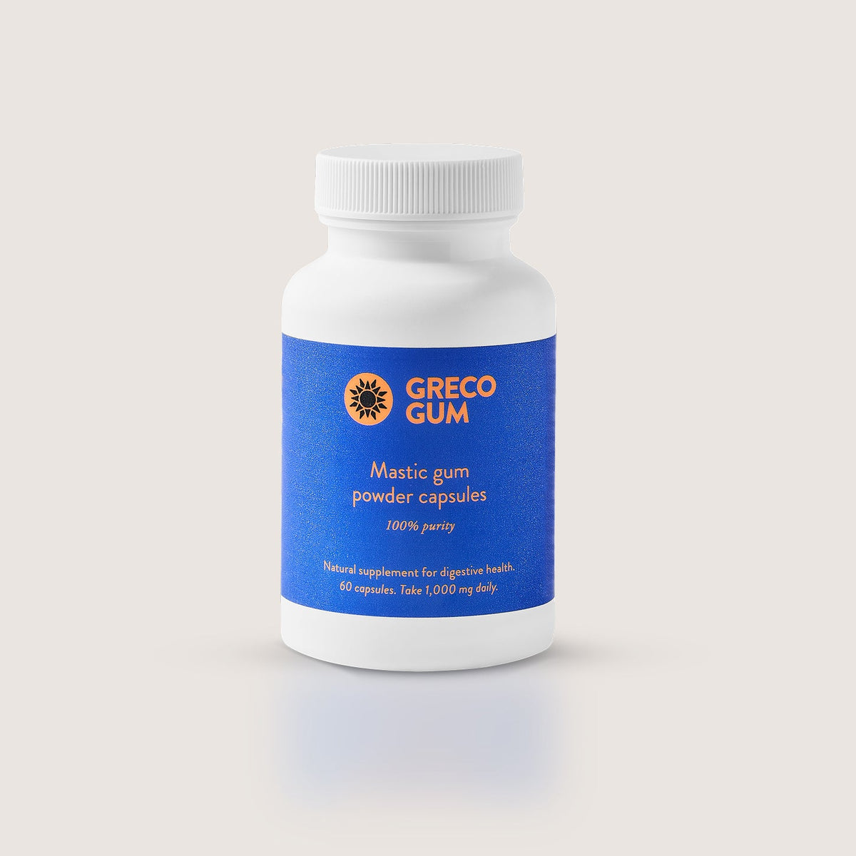 Pure mastic gum in powder form, portioned into capsules. Taken as a dietary supplement to promote digestive health, reduce heartburn, and combat stomach ulcers caused by H. pylori.