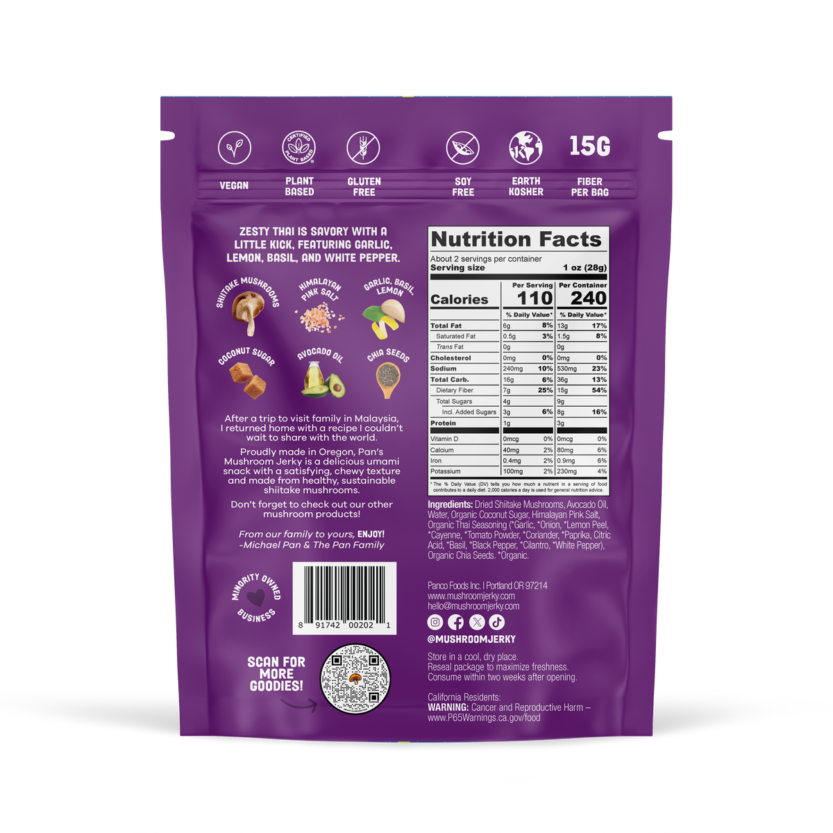 Pan's Zesty Thai Mushroom Jerky has a savory taste with a little kick, and is our most popular flavor yet.
