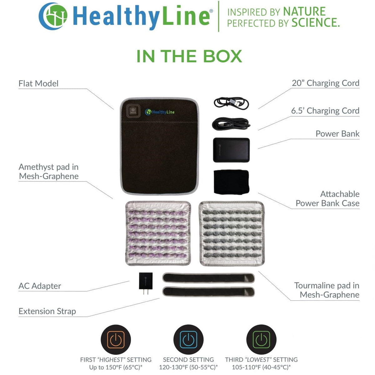 The heated flat model is a thoughtfully crafted far-infrared heating pad that incorporates an advanced carbon fiber heating system and natural gemstones to release deep penetrating far-infrared heat. It is designed to be portable bringing muscle relaxation and temporary relief of joint pain, tension and stiffness on the go or in your home whenever you need. The product’s maximum temperature is reached within approximately 25 minutes.