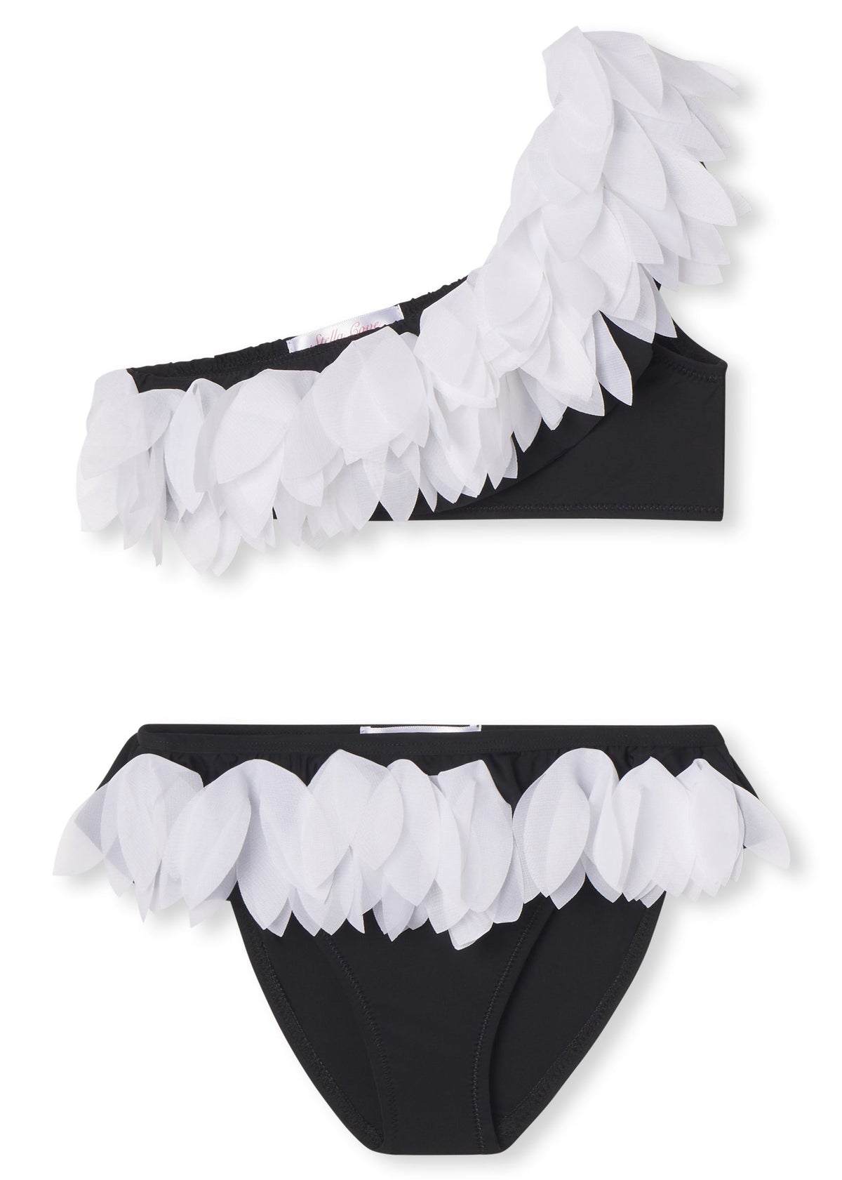 Black one shoulder bikini with signature Stella Cove petals and  matching accessories and cover ups for a complete Stella Cove beachwear look