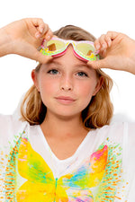 Easy to wear cover up poncho for the beach with happy colorful butterfly print and matching accessories for a complete Stella Cove beachwear look. Looks great with the neon pink swimming goggles.