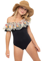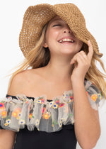 Unique floral mesh tulle swimsuit in best selling cut made from buttery soft fabric with matching accessories such as these tortoise sunglasses for girls and straw hat with matching floral detail.
