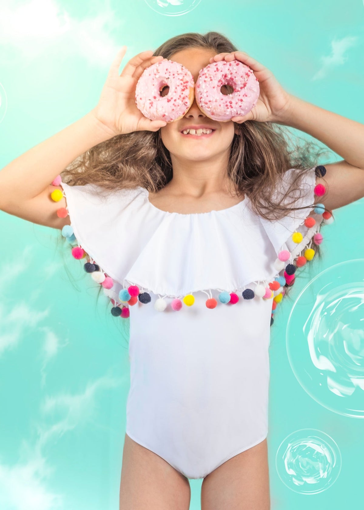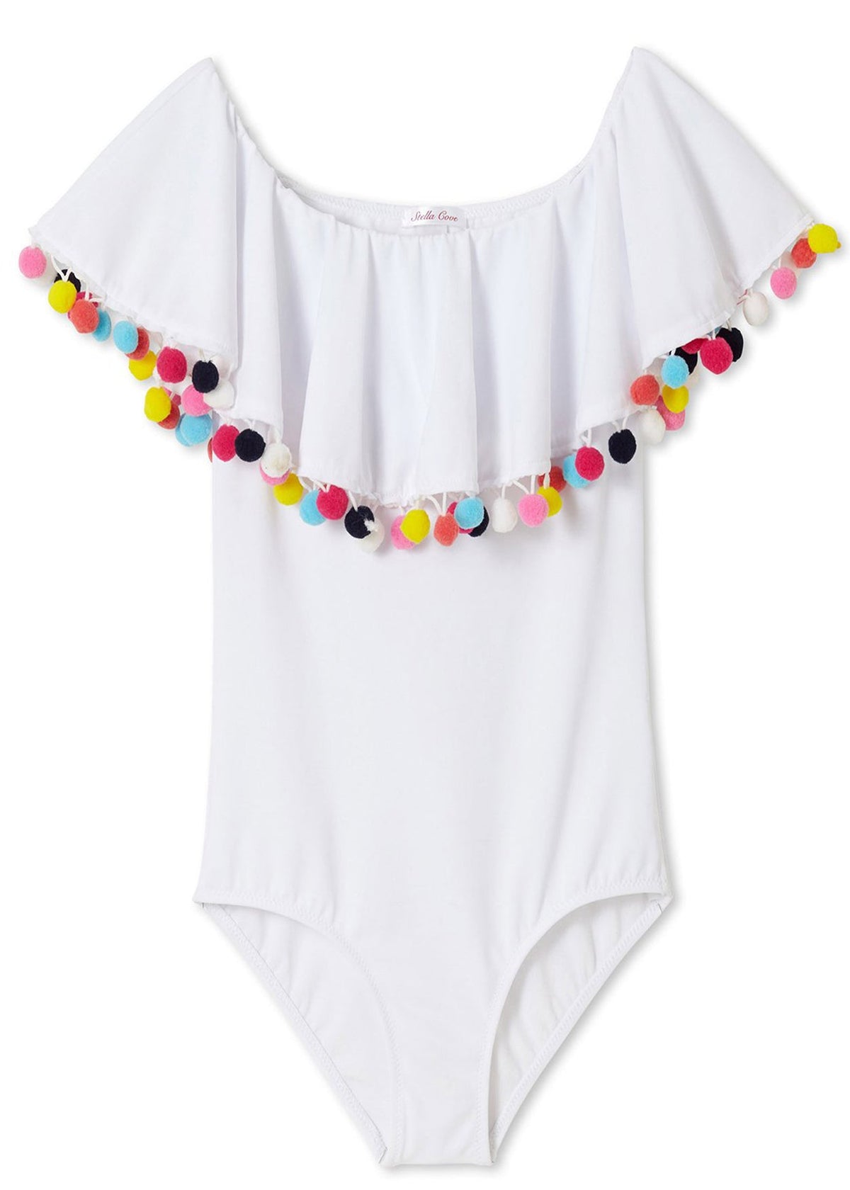 Best selling cut ruffles swimsuit with multi color pom poms for girls with matching bikini and beach cover-ups. This swimsuit looks cute with the rainbow sunglasses and