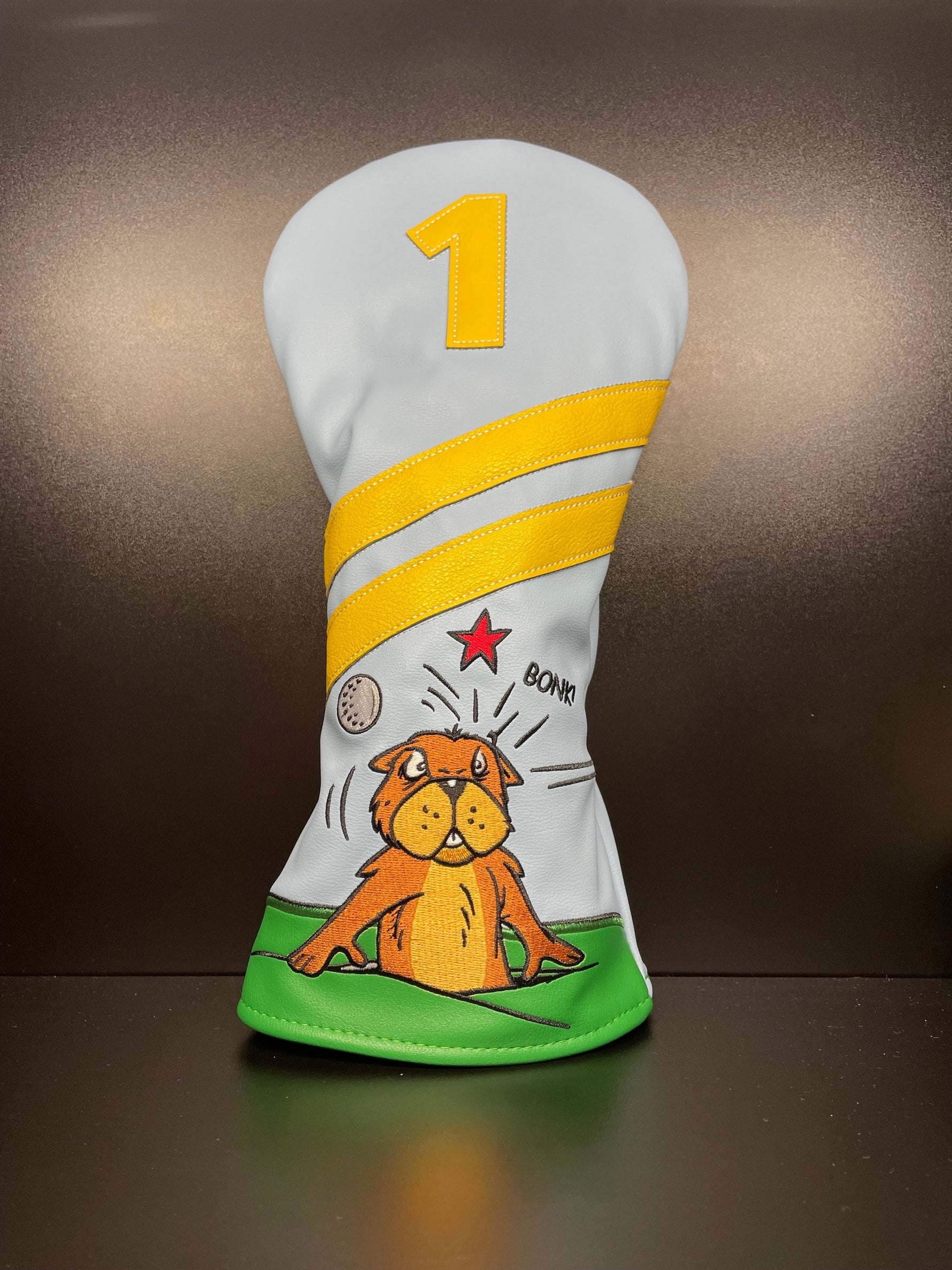 The term "Bonk" refers to the sound the gopher makes when it is hit, often referencing its antics of getting in the way of the golfers on the course. It’s a fitting and humorous touch for the headcover, adding an extra level of fun for Caddyshack fans and golfers alike.