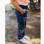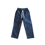 Straight-leg light denim kids' pants with worker-style reinforcement. Lightweight organic cotton denim that's perfect for warmer weather. Designed for active kids: elastic drawstring waist for easy dressing, extra long legs for those growth spurts, and reinforced knees. Designed to fit 2x longer.