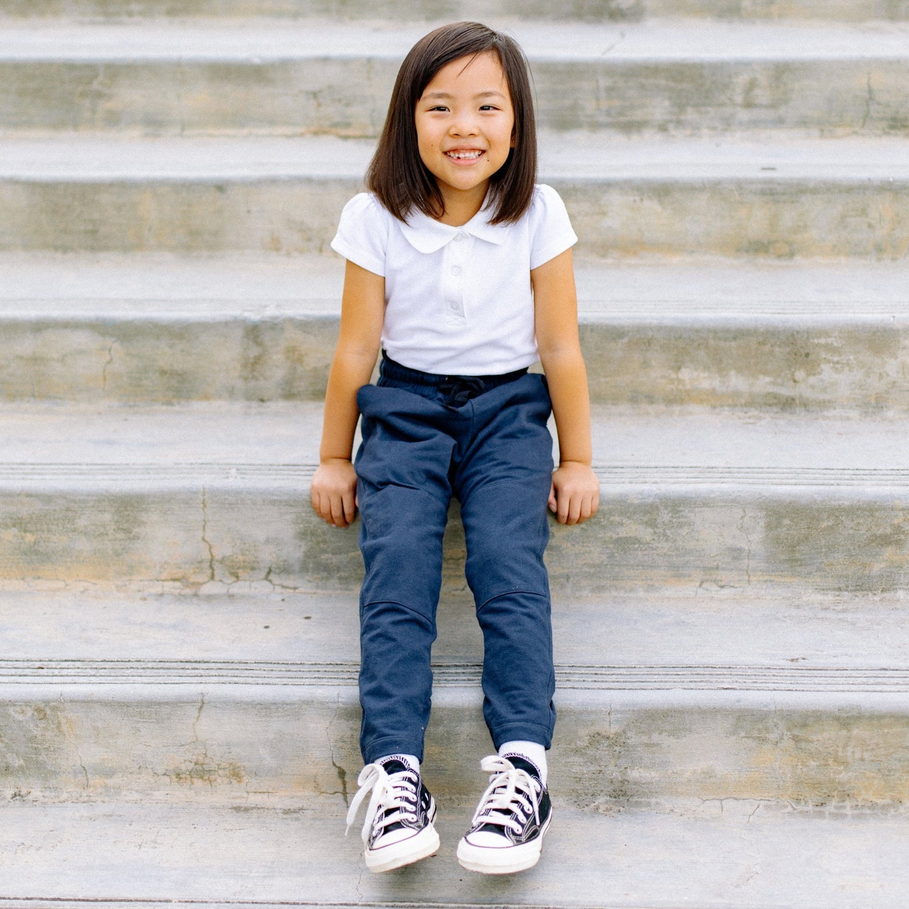 Our best-selling pants are your kid's new favorite sweatpants. Fairly made with organic cotton loopknit in navy blue. Designed for kids on the move: a draw-string waist for comfort, reinforced knees for extra durability, and extra-long legs so kids can keep growing into them. School uniform-friendly.