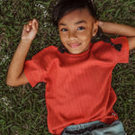 The ultimate updated classic t-shirt with a drop-shoulder tee to grow with your kid. Made from deadstock organic cotton with a ribbed texture and bright persimmon color.