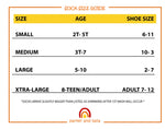 Fits Kids age 3T all the way up to adult size 12. Scroll through Pictures to see our size chart.