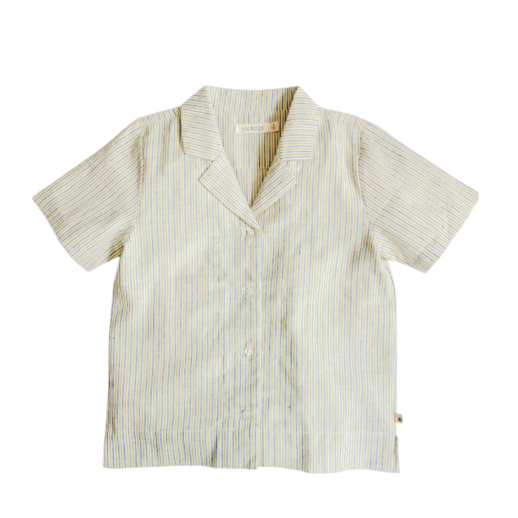 The subtle natural, olive, and blue stripe brings laid-back charm, while white shell buttons add a timeless finish. With its boxy cut and relaxed fit, it wears well open or buttoned-up, layered or solo.