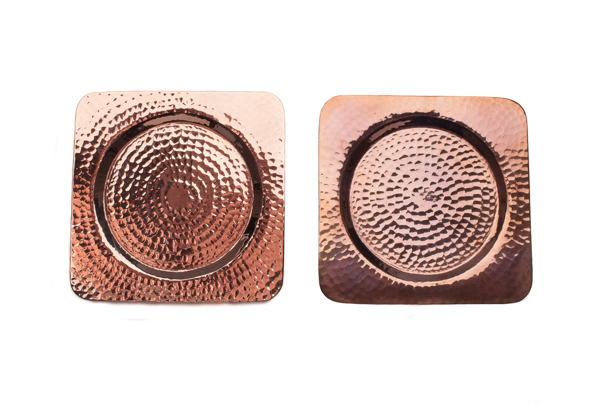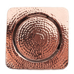 Hand hammered, pure copper coasters for wine and spirit bottles, fat and slender.  Round and Square shapes are perfect for any kind of bottle service, flower vase or candle base. This hand hammered beauty casts a warm intimate light, protects the table surface from drips and adds an elegant detail to a gourmet dining experience or even the most casual backyard hang. Reflecting a warm intimate light while protecting your surface from stains. Great for keys and vanities too.