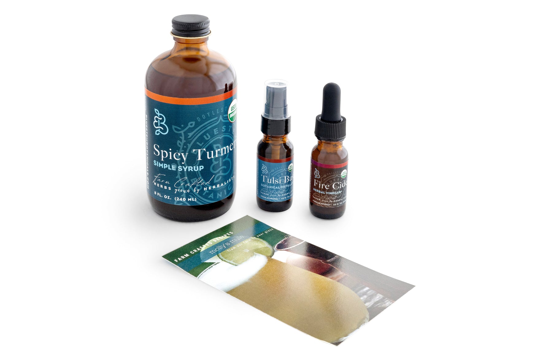 Molly's Mule includes: Spicy Turmeric Simple Syrup + Fire Cider +Tulsi Basil Aromatizer.  These botanical extracts are paired perfectly with Apple Cider & Lime Juice for a complex and aromatic alcohol-free cocktail.