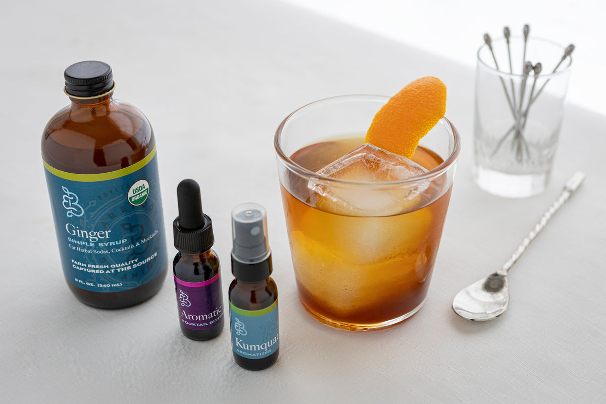 Our botanical extracts of Ginger, Aromatic Bitters, and Kumquat are combined with Revivalist Botanical Whiskey (or whiskey of your choice) and large format ice cube for a great Old Fashioned with a botanical twist