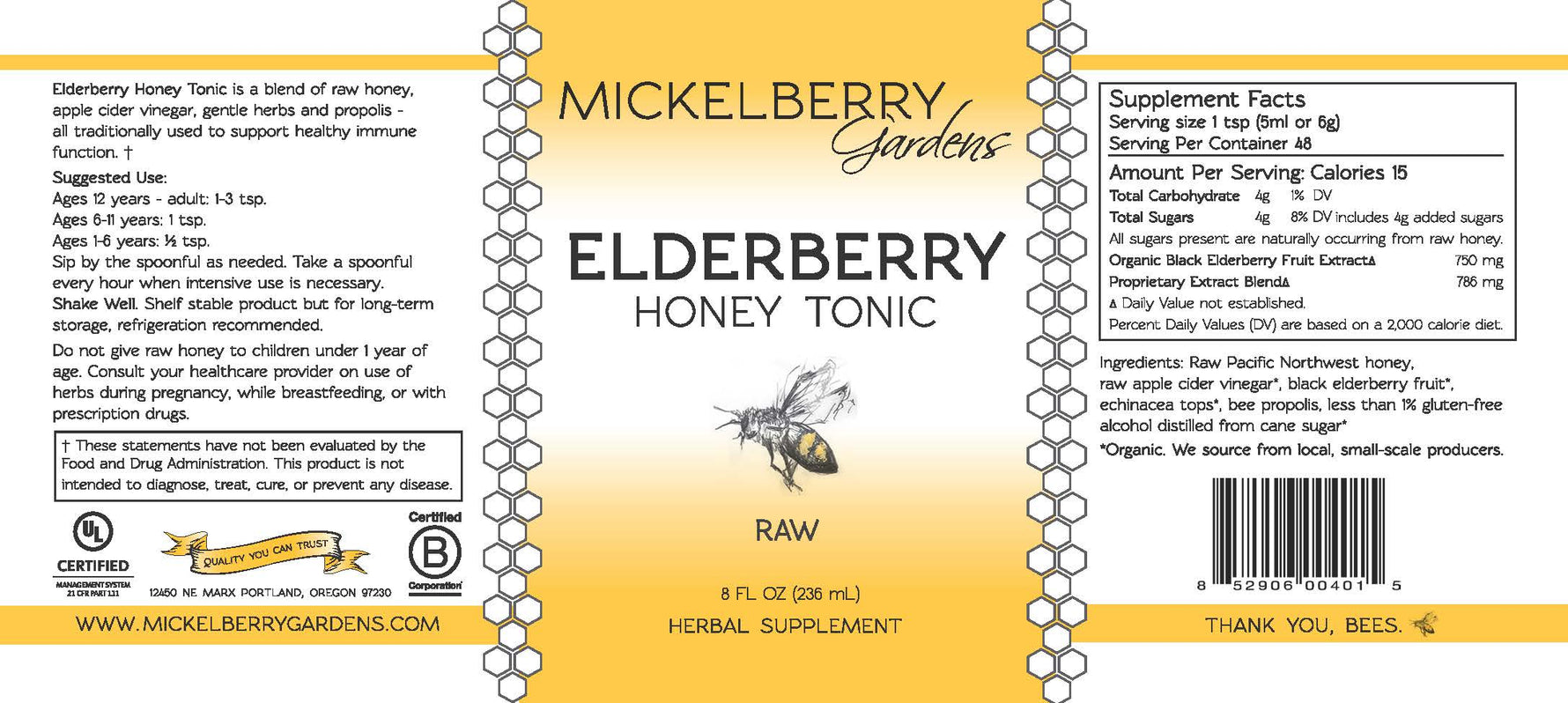 Mickelberry Gardens Elderberry Honey Tonic is a blend of raw honey, raw apple cider vinegar, and gentle herbal remedies traditionally used to support healthy immune function. We have included organic black elderberries, organic echinacea tops, and Pacific Northwest propolis to support and nourish the immune system. It’s an excellent addition to the family medicine cabinet - kids love it!