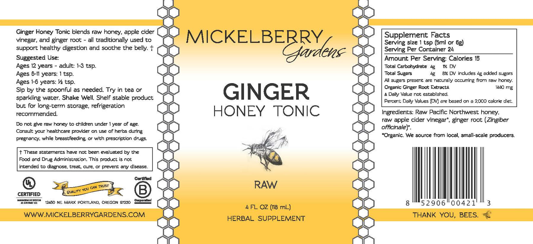 Mickelberry Gardens Ginger Honey Tonic is a blend of raw Pacific Northwest wildflower honey, organic raw apple cider vinegar and organic ginger root (Zingiber officinalis). This tonic is designed to support good digestion and a happy belly.