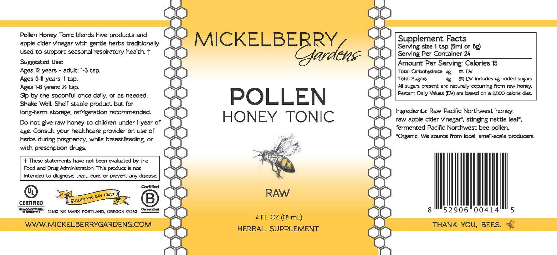 Mickelberry Gardens Pollen Honey Tonic is a RAW oxymel – made with local raw honey and raw apple cider vinegar. Hippocrates promoted using vinegar mixed with honey as both an energizing tonic and a healing elixir. When honey is kept raw, it retains all of its healing virtues and preserves the delicate flavors from millions of wildflowers. Raw apple cider vinegar is rich with vitamins, antioxidants, enzymes, and probiotics, and helps to jump-start digestion.
