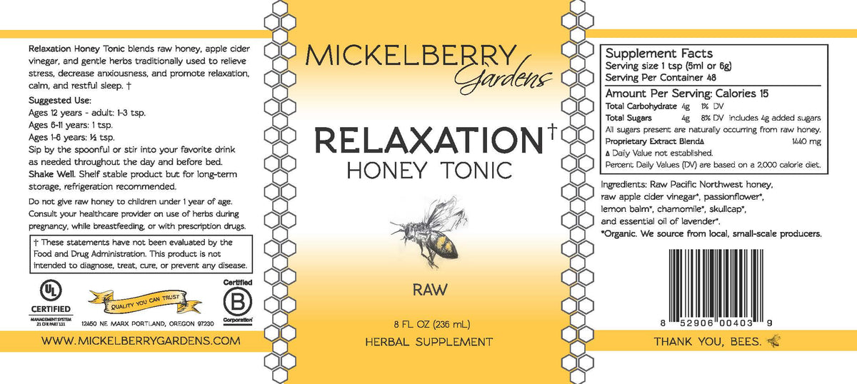 Take Mickelberry Gardens Relaxation Honey Tonic by the spoonful as needed. It's lovely at the end of the day to help unwind.