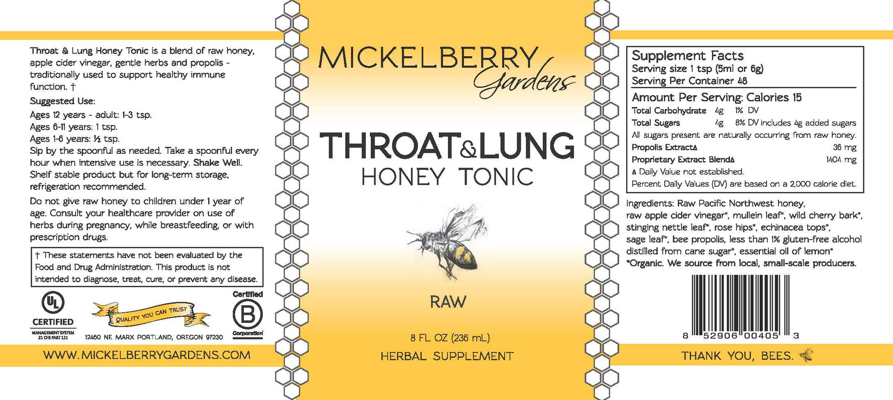 Take Mickelberry Gardens Throat&Lung Honey Tonic daily by the spoonful, and take a spoonful as often as every hour when more intensive use is needed.