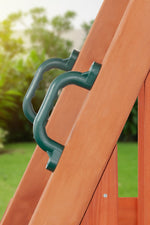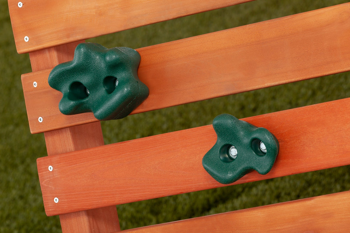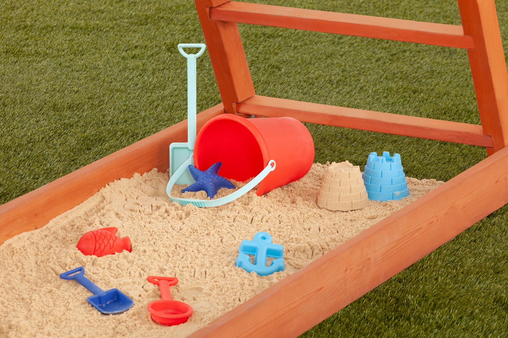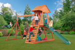 The Cedar Chalet Complete Wooden Playset is designed at a compact size for smaller backyards, but is a fun-filled backyard escape. Measuring 17' 8” long by 9’ deep, this playset doesn’t take up as much backyard space as many units do, but packs in fun features and sturdy support beams ensuring a small space, high-quality playset. The Chalet-inspired wooden roof offers a shady retreat in the main tower, as well as in the spacious sandbox underneath. All wood is pre-cut, pre-drilled, and pre-stained for easy assembly. Featuring two swings and a trapeze bar, as well as a rock-climbing wall, slide, steering wheel, and wooden ladder, this playset is all about action! Kids can build arm strength and hang like an acrobat on the trapeze, soar to new heights on the double swings, construct sand castles underneath the tower, scale the rock wall to the 4 ft. deck, or race down the slide!