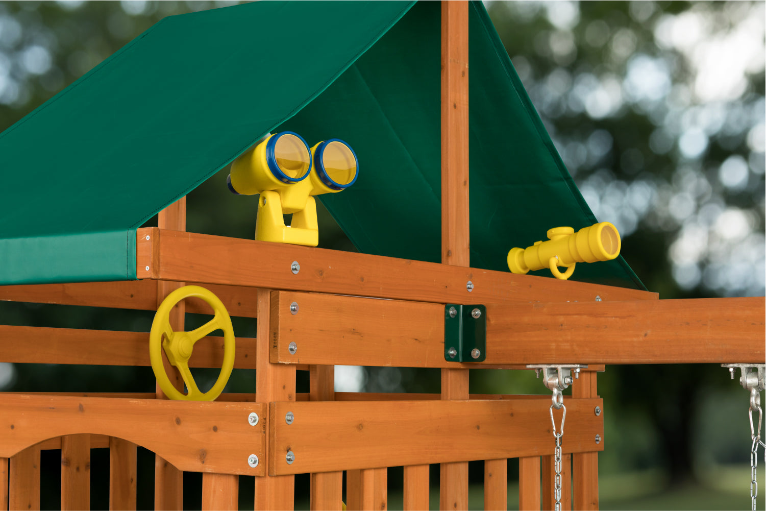 - 3 in. x 4 in. solid cedar framing, heavy duty swing hangers and installation hardware, and injection-molded polyethylene swing set accessories ensure that your play set will weather years of outdoor use