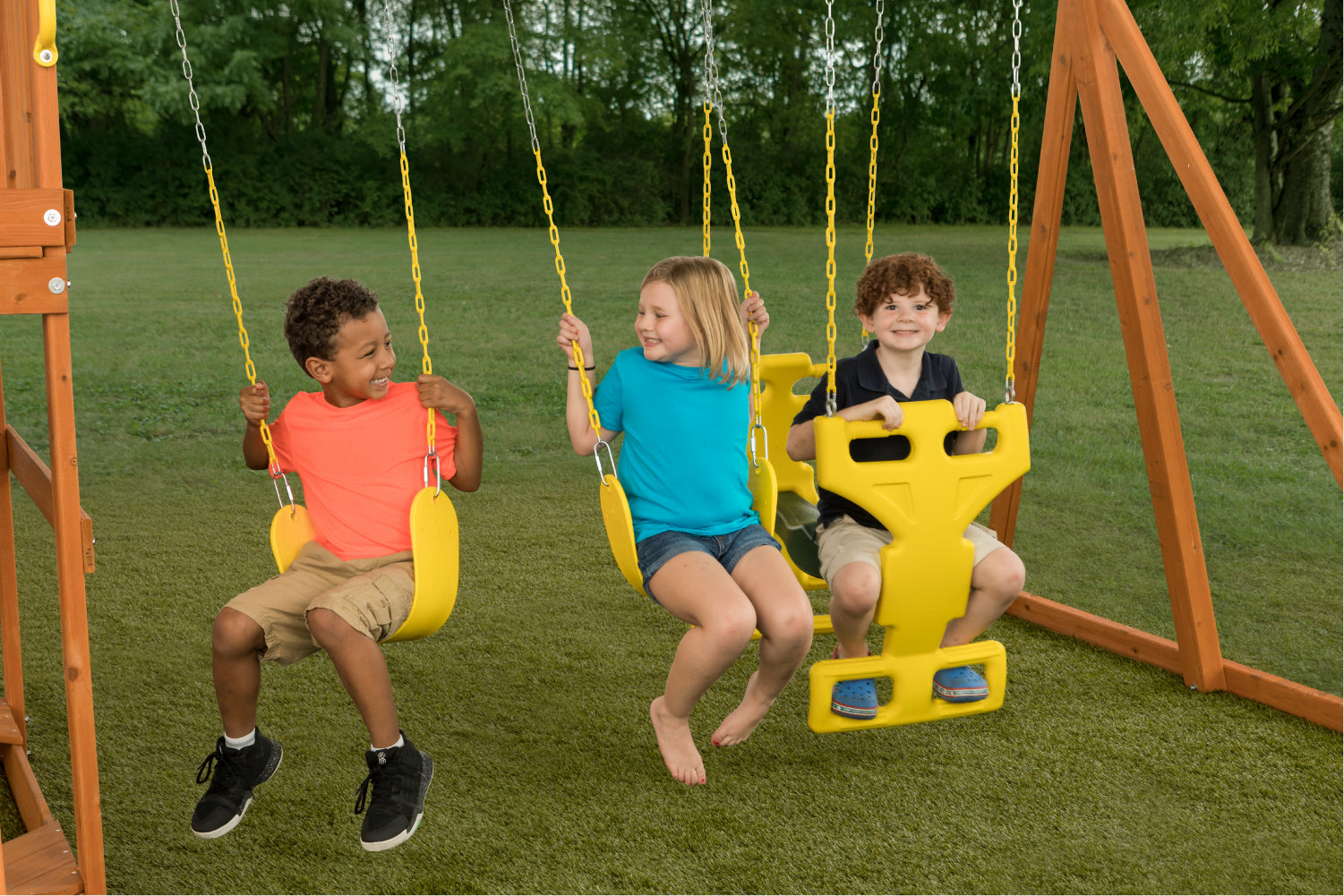 - No-pinch, vinyl-dipped swing set chains and durable, single-piece construction swing set accessories are designed with small hands in mind - no hassle, no fuss