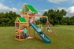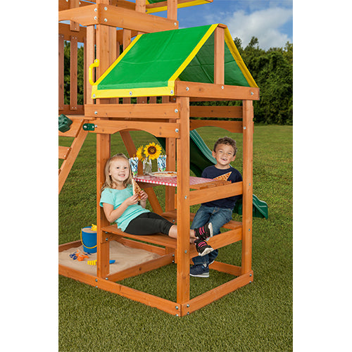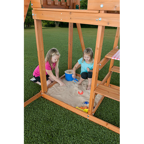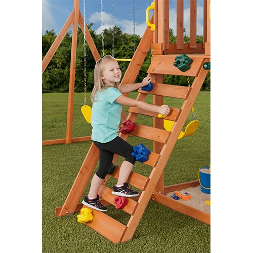 • Woodlands Wooden Swing set Kit comes with four-foot tower, slide, Rock Climbing Wall with 6 heavy duty climbing rocks, built in picnic table, built in sandbox, two belt swings, a ring trapeze, two tarp roofs, safety handles, swing hangers, anchoring kit, and all hardware, lumber & instructions necessary for assembly.
