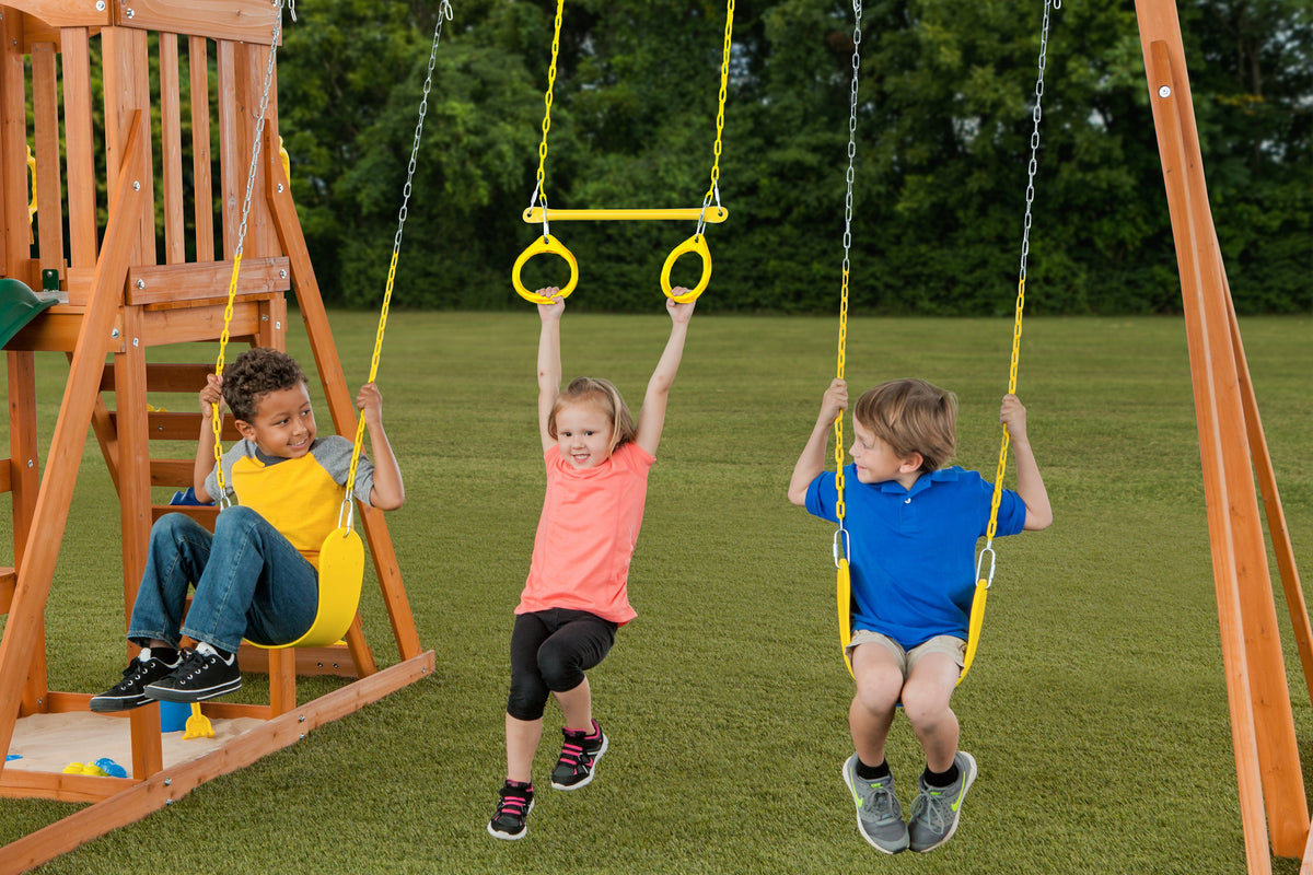 • Naturally rot-resistant cedar swing set construction and play-safe polyethylene swing set accessories make this ASTM-compliant outdoor playset a worry-free experience, ensuring your children’s safe play and the longevity of your new backyard play equipment