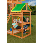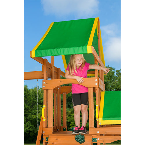 The Woodlands Wooden Playset by Creative Cedar Designs is a great Swing set for smaller backyards or for beginners! The strength-building rock climbing wall with heavy duty multi-colored rocks leads up to the lookout tower, which is covered in a sturdy yellow & green tarp roof. Kids can then zoom down the exciting slide to feel the wind in their hair! The second, shorter tower contains a picnic table, which is perfect for picnics, tea parties, crafts, coloring, or homework. Shaded by a tarp roof, your kids can comfortably spend hours outdoors. The two belt swings and the ring & trapeze bar combo are always a hit with kids, and can entertain three kids side by side endlessly. The space under the main tower can be left as is, or used a sandbox for additional fun! Just line the bottom with weed repellent tarp, and fill with sandbox sand from your local hardware store.