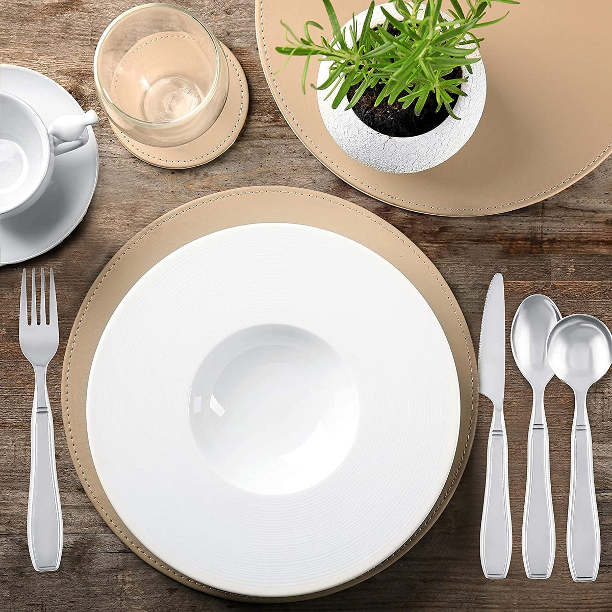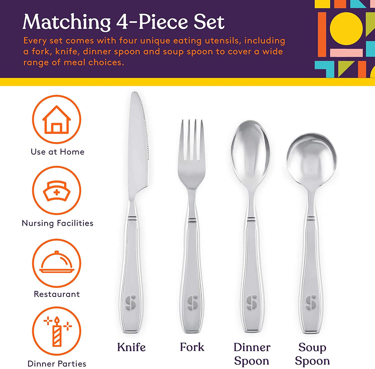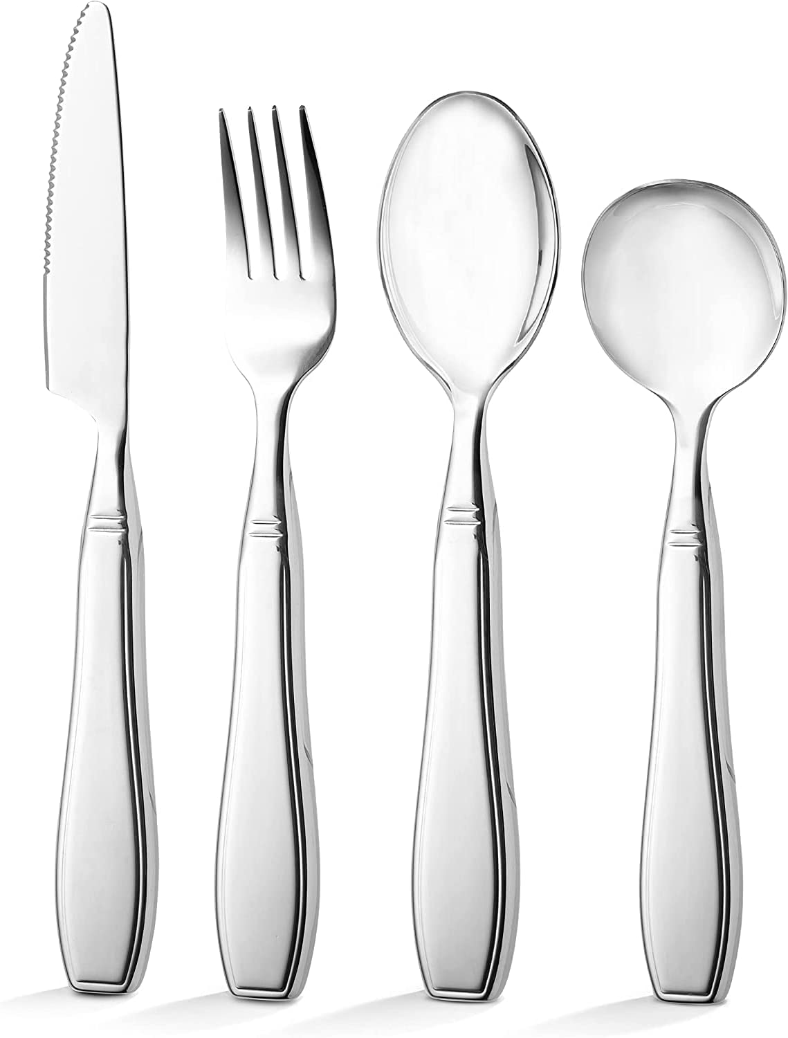 The good grip easy grip utensil set is a 4 pack of silverware with premium stainless steel handles for easy holding. These utensils feature aheavy thick handle and premium steel tips that are designed for use by anyone who suffers from dexterity issues. They are discreet and dishwasher safe and are protected by a 60-day warranty.