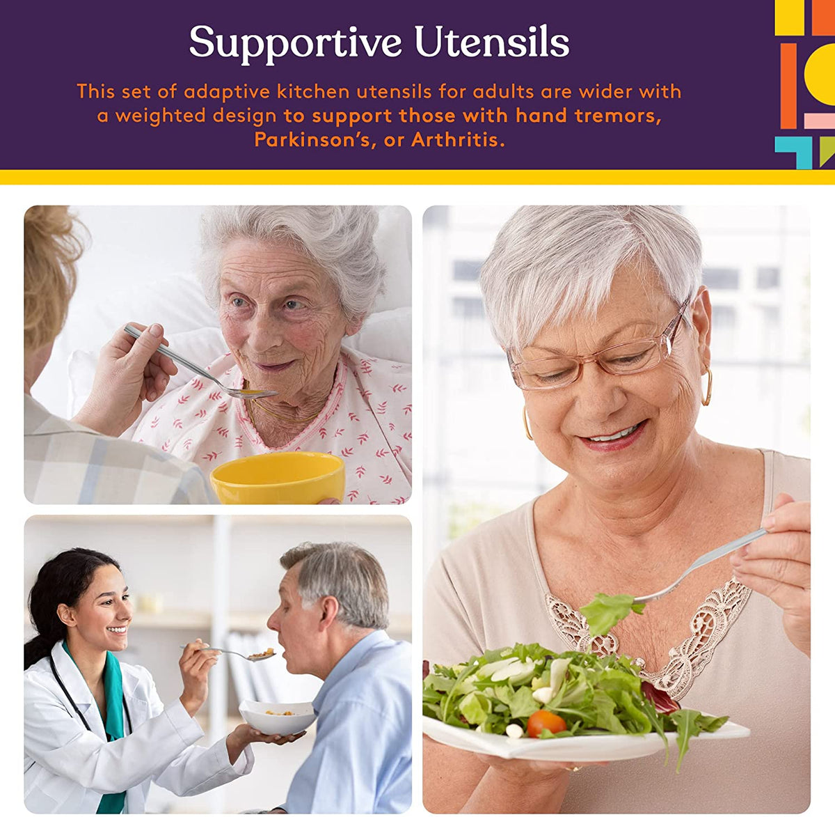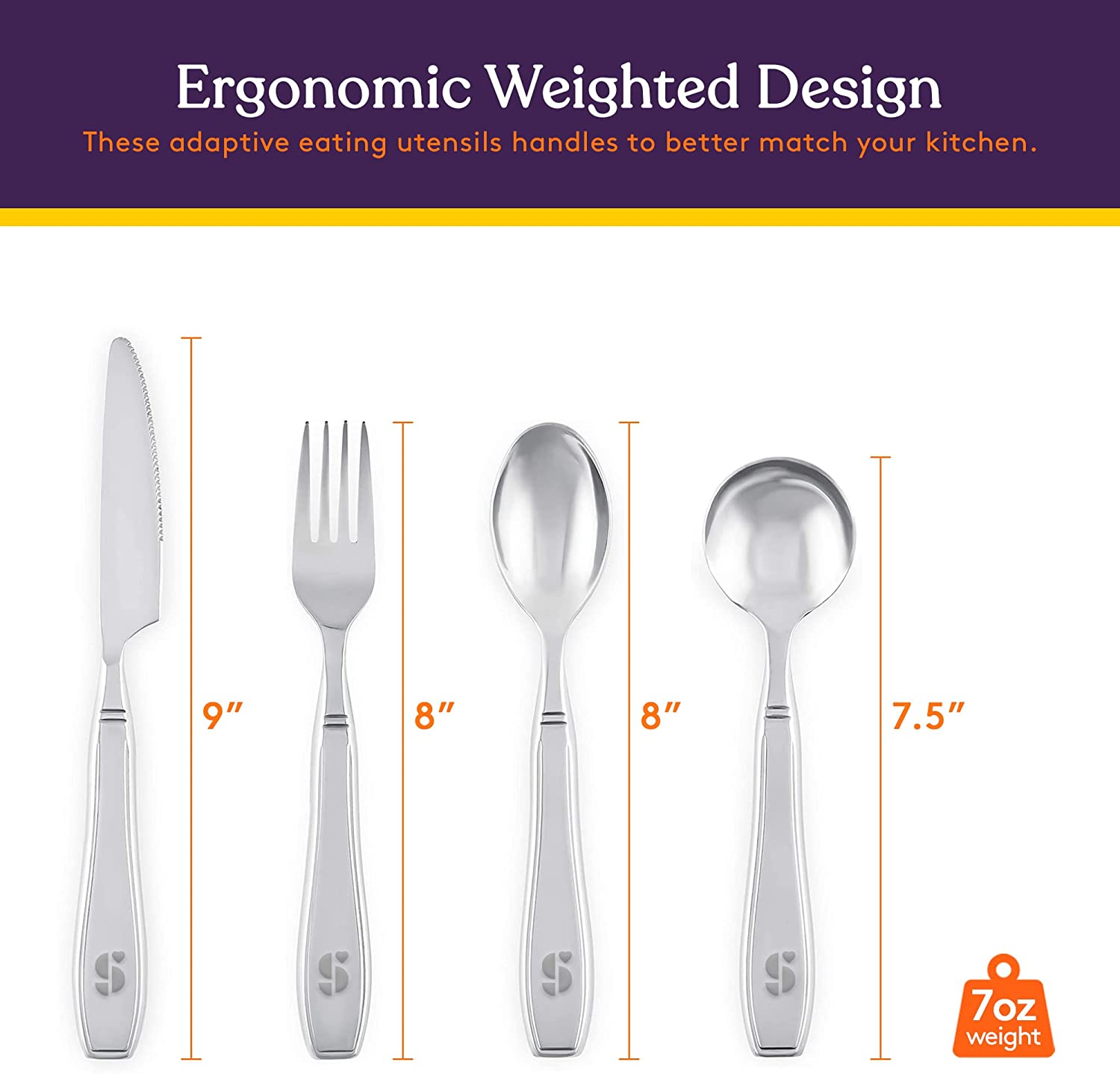Adaptive Utensils - WEIGHTED 7 oz. Arthritis Aid Silverware - Easy Grip for Shaking, Elderly & Trembling Hands - Stainless Steel Spoons, Fork & Knife