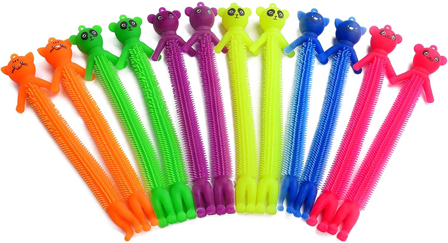 12 Animal Stretchy Strings in bright, kid-friendly colors: red, yellow, blue, orange, light green, and purple