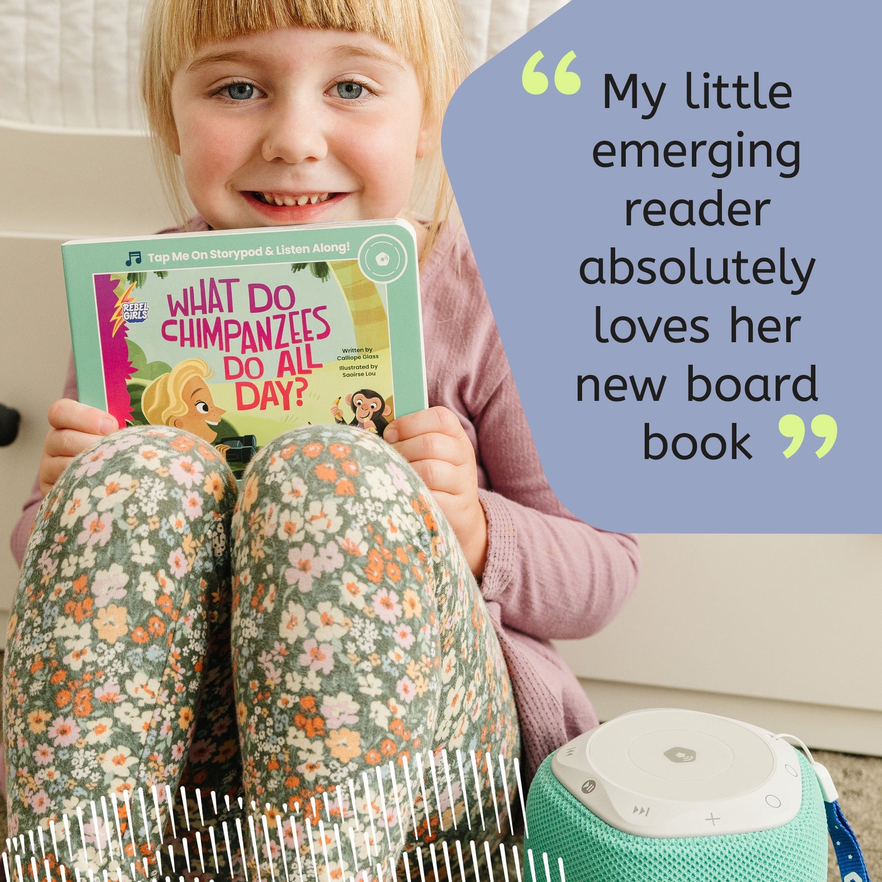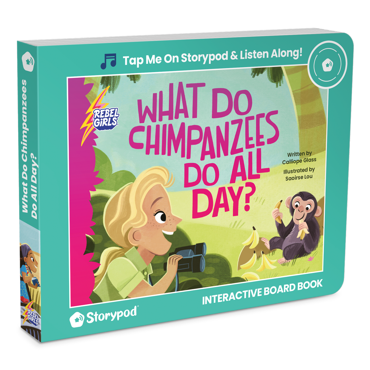 Come on an exploratory journey with Rebel Girls' "What Do Chimpanzees Do All Day?". This interactive board book invites little animal lovers to adventure into the jungle, through the desert, and under the sea to uncover the answers to big questions posed by curious women—and to learn more about them too!