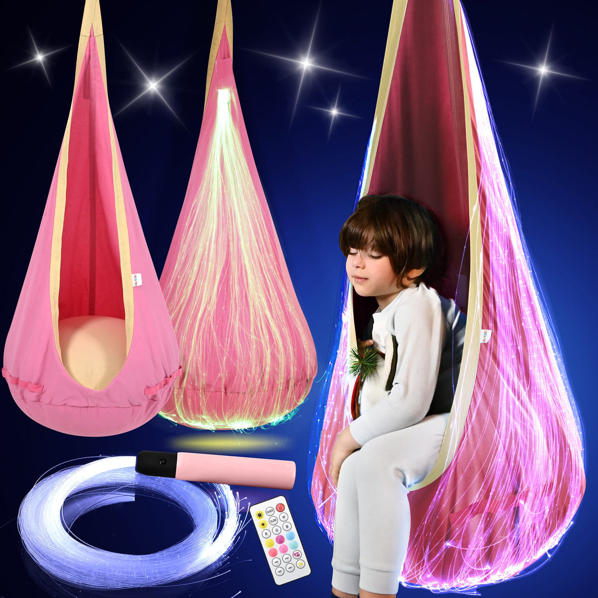 Unwind in a glowing sensory retreat with the Sensory Swing, blending gentle motion and soothing fiber optic light to create a calm and comforting space for relaxation and sensory play.