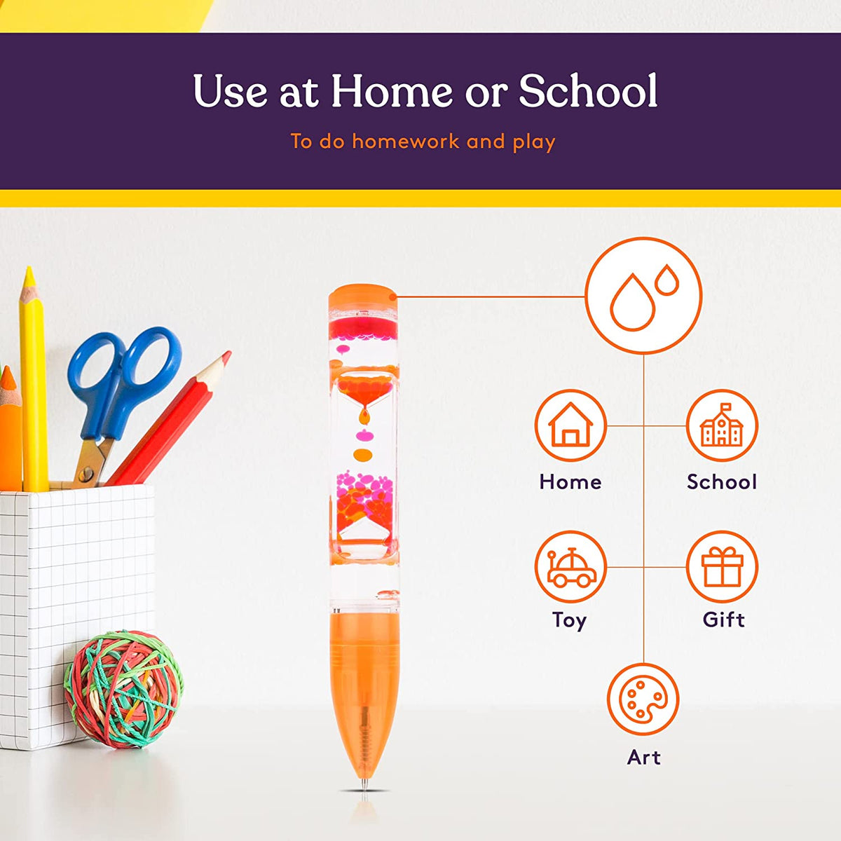 Designed with colorful oil droplets suspended inside a smooth-flowing liquid, these pens use gravity to slowly drop little “bubbles” down the hourglass design, creating a natural motion and relaxing effect that’s perfect for kids and adults.