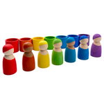 Each of the seven rainbow wooden peg dolls in this adorable set comes nestled in a matching cup of the same color in various rainbow colors and a diverse range of skin tones.