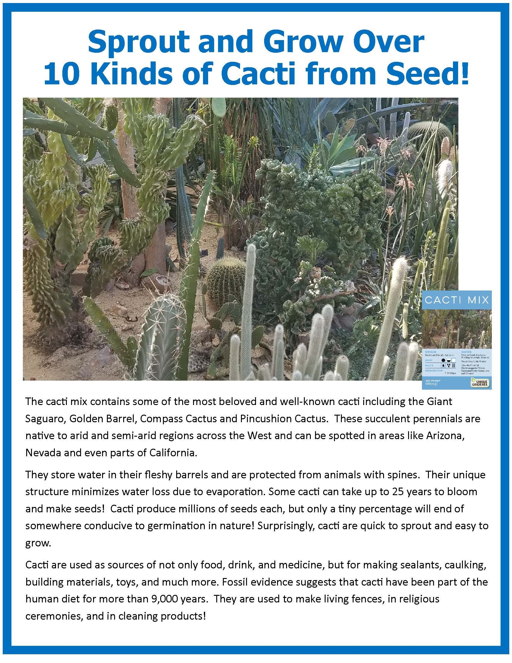 Cacti are beautiful and easy to grow.  Best yet, this varied collection of cacti requires almost no attention to flourish.  In fact, you only need to water them once a month after the seeds sprout!  The cacti mix contains some of the most beloved and well-known cacti including the Giant Saguaro, Golden Barrel, Compass Cactus and Pincushion Cactus.  These highly adaptable plants will naturally conform to the size of the container they are growing in and will happily grow for years!
