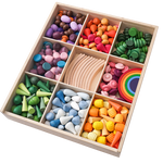 The whole set includes 252 mandala pieces, a 6 pcs mini rainbow stacker, and 10 pcs Abel-inspired mini natural wooden building blocks in a wooden storage tray (with a clear lid). The loose parts are between 1/2 to 2 inches, and the tray size is 16.5 x 14 x 2.8 inches.