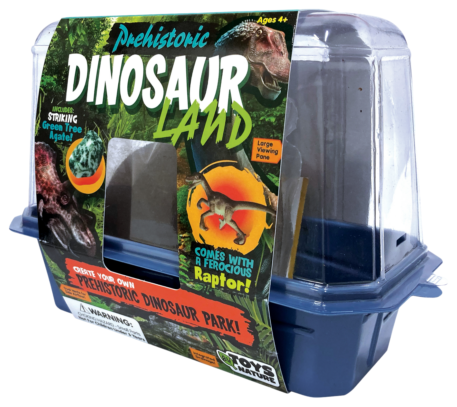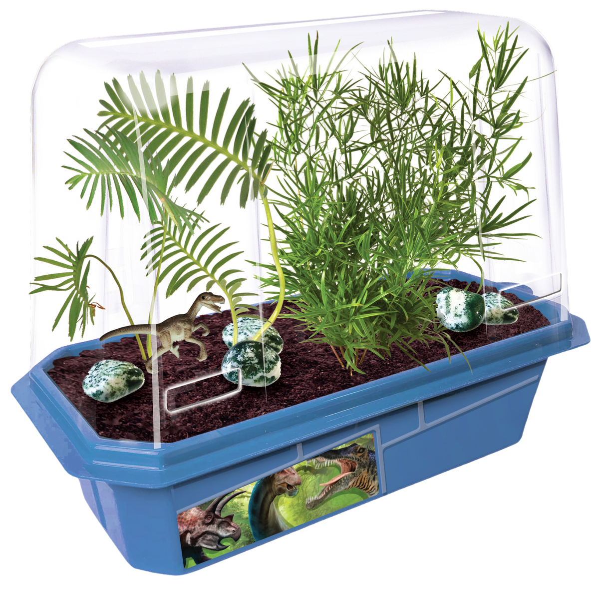 The custom planter features a drainage basin, side ventilation, and large viewing panes. The complete kit comes with everything you need to make your own Jurassic park- just add water!